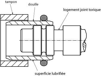 Etanchéité piston: le joint torique est enfilé dans une douille pour en dilater le diamètre interne et lui permettre de dépasser les profils irréguliers de la pièce; quand la douille arrive à proximité du logement, le tampon qui pousse le joint torique dans le logement de destination intervient.